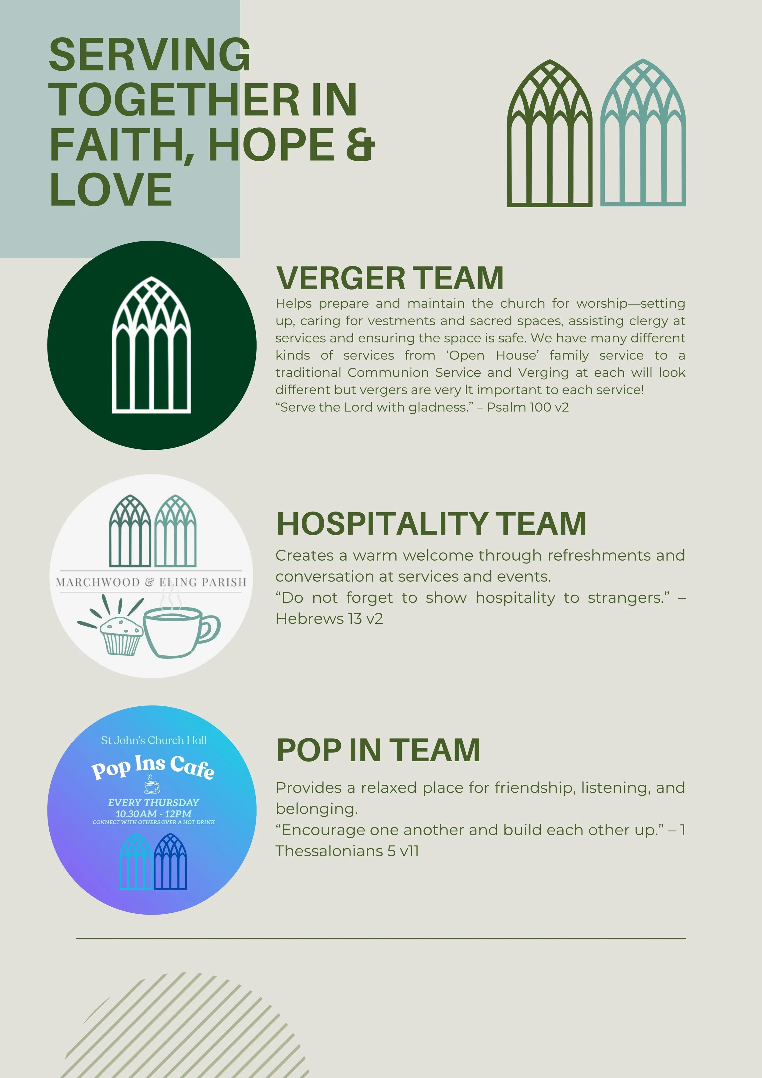 Worship can happen in so many ways, giving financially, singing, prayer, silence and serving. Becoming a member of a team is part of our worship as we jump into the shared life of God’s Church. We love to watch people’s vocations unfold and to support new leaders in all areas of Church ministry. Below is more info on being part of our teams in Marchwood and Eling Parish.